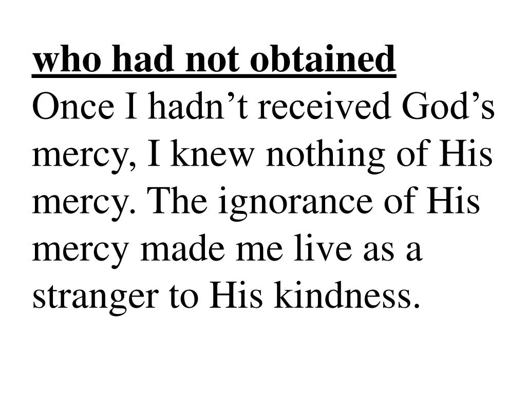 who had not obtained Once I hadn’t received God’s mercy, I knew nothing of His mercy. The ignorance of His mercy made me live as a stranger to His kindness.