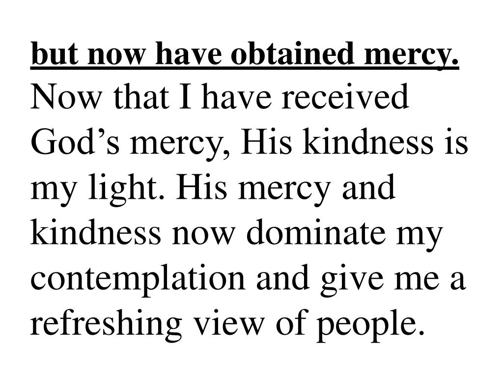 but now have obtained mercy. Now that I have received God’s mercy, His kindness is my light. His mercy and kindness now dominate my contemplation and give me a refreshing view of people.