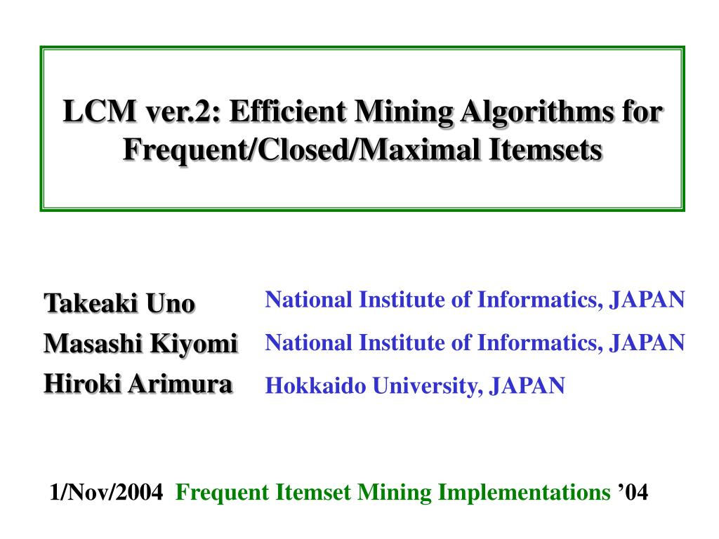 LCM ver.2: Efficient Mining Algorithms for Frequent/Closed/Maximal Itemsets. National Institute of Informatics, JAPAN National Institute of Informatics, JAPAN Hokkaido University, JAPAN. Takeaki Uno Masashi Kiyomi Hiroki Arimura. 1/ Nov/2004 Frequent Itemset Mining Implementations ’04.