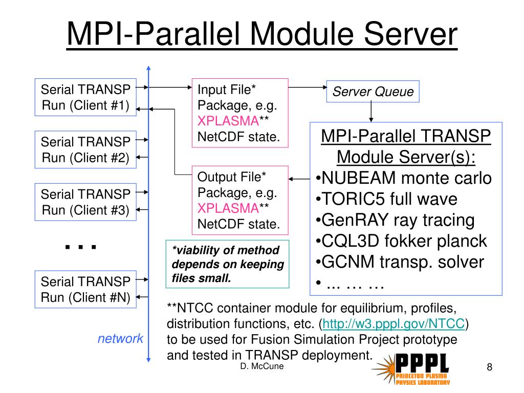 MPI-Parallel Module Server Serial TRANSP Run (Client #1) Input File* Package, e.g. XPLASMA** NetCDF state. Server Queue • MPI-Parallel TRANSP • Module Server(s): • NUBEAM monte carlo • TORIC5 full wave • GenRAY ray tracing • CQL3D fokker planck • GCNM transp. solver • ... … … Serial TRANSP Run (Client #2) Output File* Package, e.g. XPLASMA** NetCDF state. Serial TRANSP Run (Client #3) … *viability of method depends on keeping files small. Serial TRANSP Run (Client #N) **NTCC container module for equilibrium, profiles, distribution functions, etc. (http://w3.pppl.gov/NTCC) to be used for Fusion Simulation Project prototype and tested in TRANSP deployment. network D. McCune