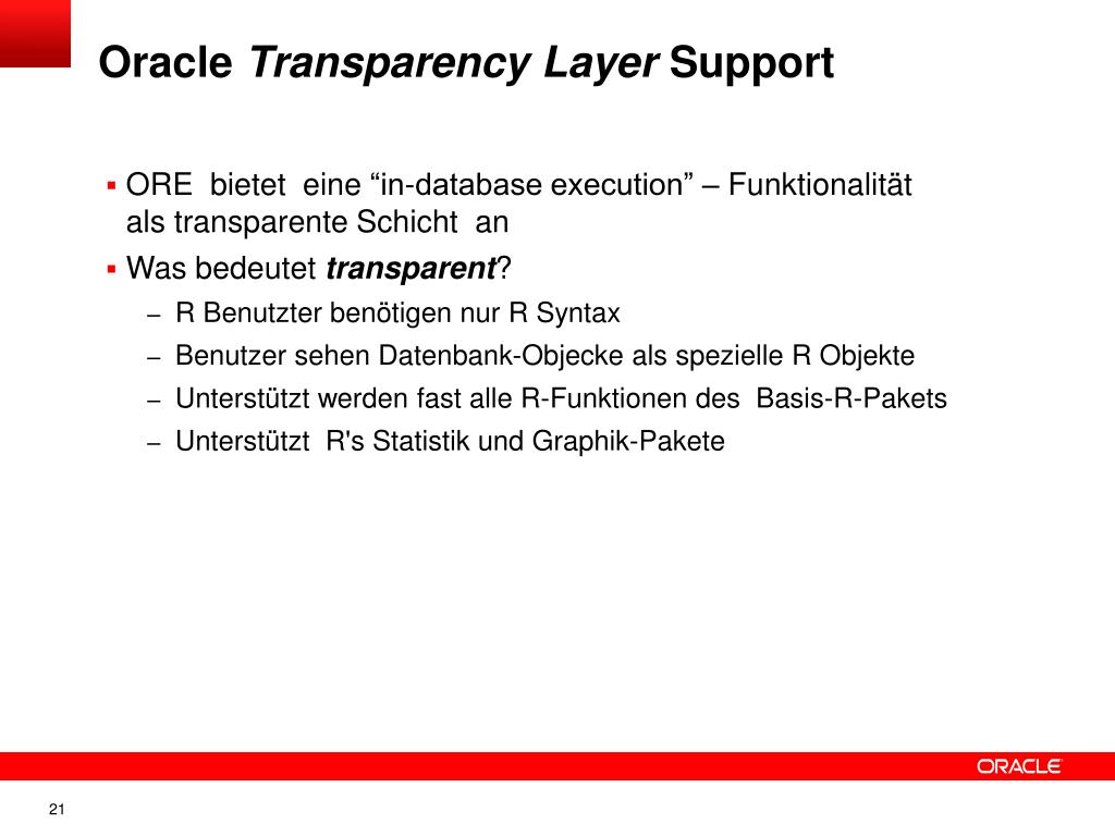 Oracle Transparency Layer Support • ORE bieteteine “in-database execution” – FunktionalitätalstransparenteSchicht an • Was bedeutettransparent? • R Benutzterbenötigennur R Syntax • BenutzersehenDatenbank-Objeckealsspezielle R Objekte • Unterstütztwerdenfast alle R-Funktionendes Basis-R-Pakets • Unterstützt R's Statistik und Graphik-Pakete