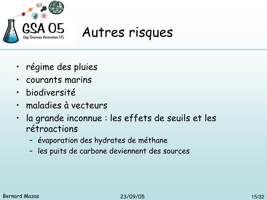 Autres risques • régime des pluies • courants marins • biodiversité • maladies à vecteurs • la grande inconnue : les effets de seuils et les rétroactions • évaporation des hydrates de méthane • les puits de carbone deviennent des sources 23/09/05