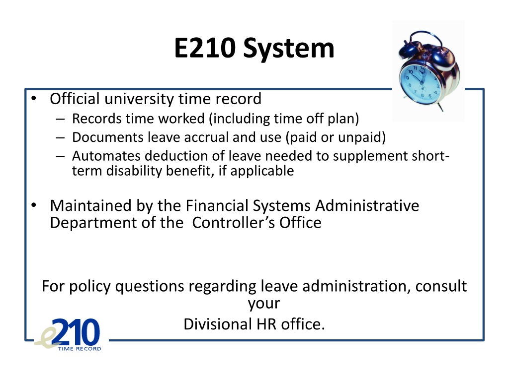E210 System • Official university time record • Records time worked (including time off plan) • Documents leave accrual and use (paid or unpaid) • Automates deduction of leave needed to supplement short-term disability benefit, if applicable • Maintained by the Financial Systems Administrative Department of the Controller’s Office For policy questions regarding leave administration, consult your Divisional HR office.