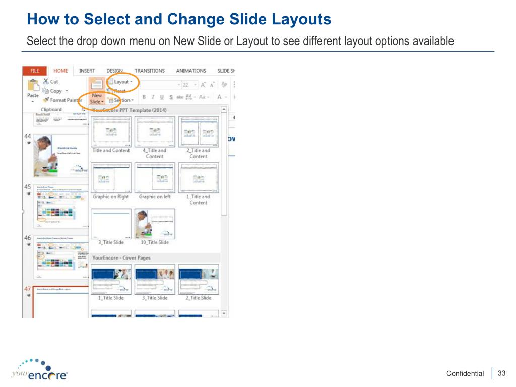 How to Select and Change Slide Layouts Select the drop down menu on New Slide or Layout to see different layout options available