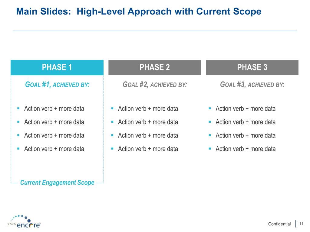 Main Slides: High-Level Approach with Current Scope Phase 1 Phase 2 Phase 3 Goal #1, achieved by: Goal #2, achieved by: Goal #3, achieved by: • Action verb + more data • Action verb + more data • Action verb + more data • Action verb + more data • Action verb + more data • Action verb + more data • Action verb + more data • Action verb + more data • Action verb + more data • Action verb + more data • Action verb + more data • Action verb + more data Current Engagement Scope