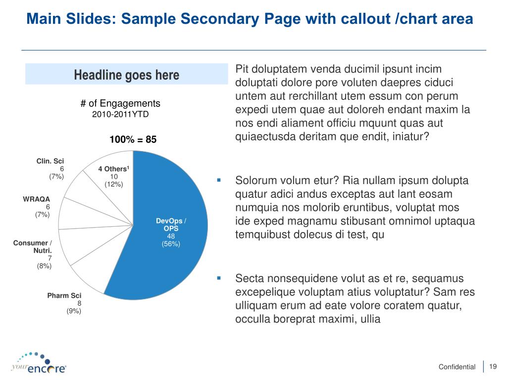 Main Slides: Sample Secondary Page with callout /chart area • Pit doluptatemvendaducimilipsuntincimdoluptatidolore pore volutendaepresciduciuntemautrerchillantutemessum con perumexpediutem quae autdolorehendant maxim la nosendialiamentofficiumquuntquasautquiaectusdaderitamqueendit, iniatur? • Solorumvolumetur? Rianullamipsumdoluptaquaturadiciandusexceptasautlanteosamnumquianosmoloriberuntibus, voluptatmosideexpedmagnamustibusantomnimoluptaquatemquibustdolecusdi test, qu • Sectanonsequidenevolut as et re, sequamusexcepeliquevoluptamatiusvoluptatur? Sam res ulliquamerum ad eatevolorecoratemquatur, occullaborepratmaximi, ullia Headline goes here • # of Engagements • 2010-2011YTD • 100% = 85 Clin. Sci 6 (7%) 4 Others1 10 (12%) WRAQA 6 (7%) Variable Resourcing 61 (72%) DevOps / OPS 48 (56%) Consumer / Nutri. 7 (8%) Pharm Sci 8 (9%)