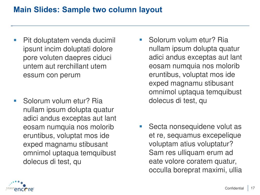 Main Slides: Sample two column layout • Solorumvolumetur? Rianullamipsumdoluptaquaturadiciandusexceptasautlanteosamnumquianosmoloriberuntibus, voluptatmosideexpedmagnamustibusantomnimoluptaquatemquibustdolecusdi test, qu • Sectanonsequidenevolut as et re, sequamusexcepeliquevoluptamatiusvoluptatur? Sam res ulliquamerum ad eatevolorecoratemquatur, occullaborepratmaximi, ullia • Pit doluptatemvendaducimilipsuntincimdoluptatidolore pore volutendaepresciduciuntemautrerchillantutemessum con perum • Solorumvolumetur? Rianullamipsumdoluptaquaturadiciandusexceptasautlanteosamnumquianosmoloriberuntibus, voluptatmos ide expedmagnamustibusantomnimoluptaquatemquibustdolecus di test, qu