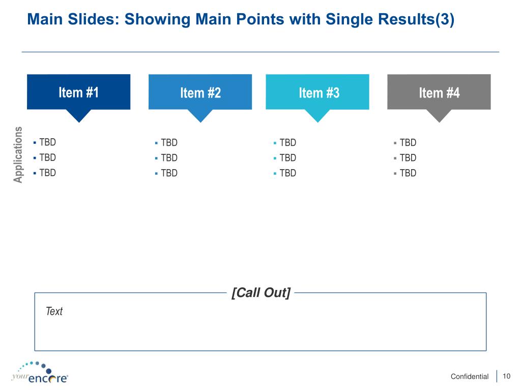 Main Slides: Showing Main Points with Single Results(3) Item #1 Item #2 Item #3 Item #4 • TBD • TBD • TBD • TBD • TBD • TBD • TBD • TBD • TBD • TBD • TBD • TBD Applications [Call Out] Text