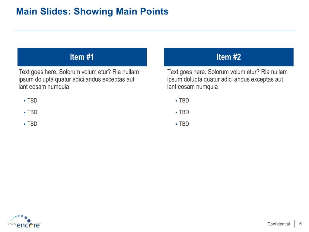 Main Slides: Showing Main Points Item #1 Item #2 Text goes here. Solorumvolumetur? Rianullamipsumdoluptaquaturadiciandusexceptasautlanteosamnumquia Text goes here. Solorumvolumetur? Rianullamipsumdoluptaquaturadiciandusexceptasautlanteosamnumquia • TBD • TBD • TBD • TBD • TBD • TBD
