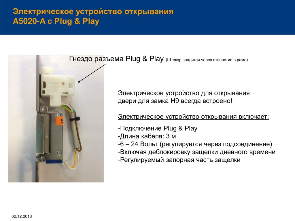 Электрическое устройство открывания A5020-A с Plug & Play Гнездо разъема Plug & Play (Штекер вводится через отверстие в раме) • Электрическое устройство для открывания двери для замка H9 всегда встроено! • Электрическое устройство открывания включает: • Подключение Plug & Play • Длина кабеля: 3 м • 6 – 24 Вольт (регулируется через подсоединение) • Включая деблокировку защелки дневного времени • Регулируемый запорная часть защелки
