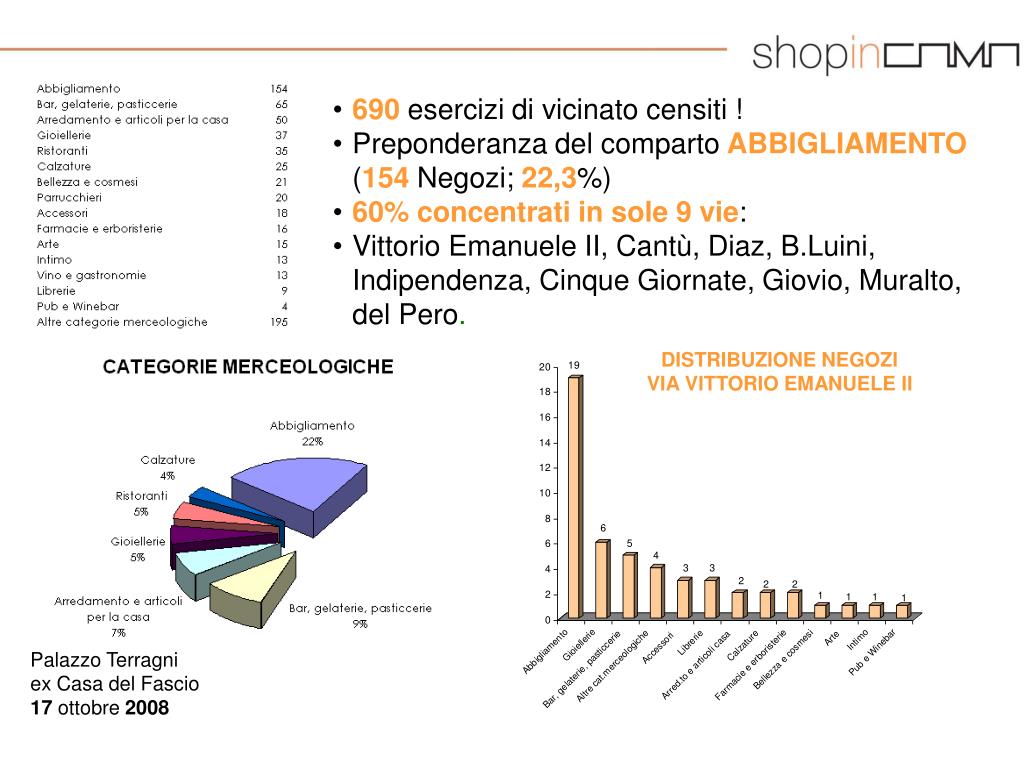 690 esercizi di vicinato censiti ! • Preponderanza del comparto ABBIGLIAMENTO(154Negozi; 22,3%) • 60% concentrati in sole 9 vie: • Vittorio Emanuele II, Cantù, Diaz, B.Luini, Indipendenza, Cinque Giornate, Giovio, Muralto, del Pero. DISTRIBUZIONE NEGOZI VIA VITTORIO EMANUELE II Palazzo Terragni ex Casa del Fascio 17 ottobre 2008
