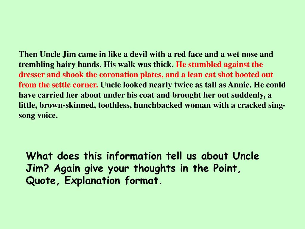 Then Uncle Jim came in like a devil with a red face and a wet nose and trembling hairy hands. His walk was thick. He stumbled against the dresser and shook the coronation plates, and a lean cat shot booted out from the settle corner. Uncle looked nearly twice as tall as Annie. He could have carried her about under his coat and brought her out suddenly, a little, brown-skinned, toothless, hunchbacked woman with a cracked sing-song voice. What does this information tell us about Uncle Jim? Again give your thoughts in the Point, Quote, Explanation format.