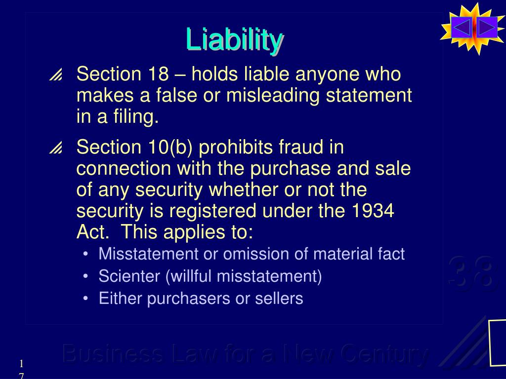 Liability • Section 18 – holds liable anyone who makes a false or misleading statement in a filing. • Section 10(b) prohibits fraud in connection with the purchase and sale of any security whether or not the security is registered under the 1934 Act. This applies to: • Misstatement or omission of material fact • Scienter (willful misstatement) • Either purchasers or sellers