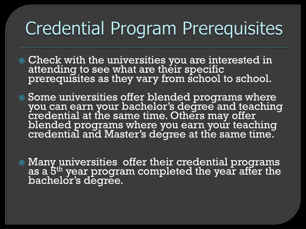 Credential Program Prerequisites • Check with the universities you are interested in attending to see what are their specific prerequisites as they vary from school to school. • Some universities offer blended programs where you can earn your bachelor’s degree and teaching credential at the same time. Others may offer blended programs where you earn your teaching credential and Master’s degree at the same time. • Many universities offer their credential programs as a 5th year program completed the year after the bachelor’s degree.