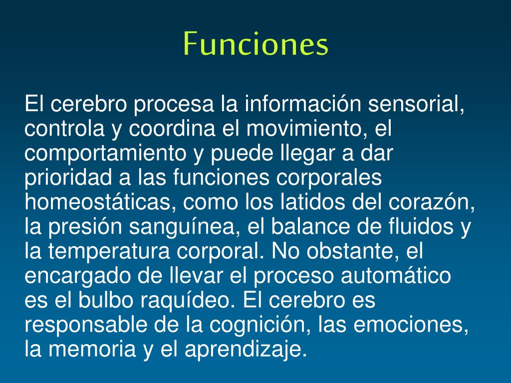 Funciones El cerebro procesa la información sensorial, controla y coordina el movimiento, el comportamiento y puede llegar a dar prioridad a las funciones corporales homeostáticas, como los latidos del corazón, la presión sanguínea, el balance de fluidos y la temperatura corporal. No obstante, el encargado de llevar el proceso automático es el bulbo raquídeo. El cerebro es responsable de la cognición, las emociones, la memoria y el aprendizaje.