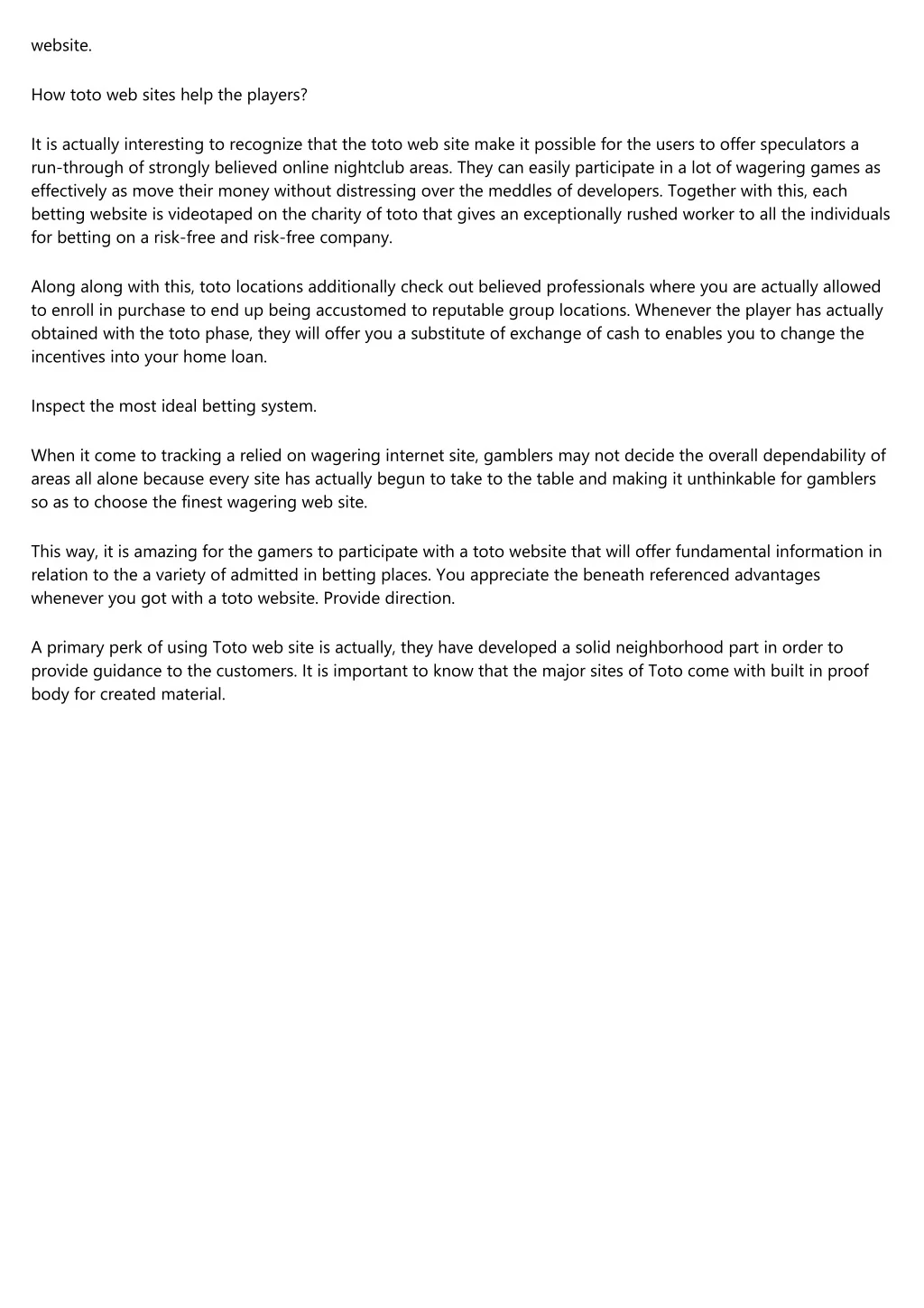 website. How toto web sites help the players? It is actually interesting to recognize that the toto web site make it possible for the users to offer speculators a run-through of strongly believed online nightclub areas. They can easily participate in a lot of wagering games as effectively as move their money without distressing over the meddles of developers. Together with this, each betting website is videotaped on the charity of toto that gives an exceptionally rushed worker to all the individuals for betting on a risk-free and risk-free company. Along along with this, toto locations additionally check out believed professionals where you are actually allowed to enroll in purchase to end up being accustomed to reputable group locations. Whenever the player has actually obtained with the toto phase, they will offer you a substitute of exchange of cash to enables you to change the incentives into your home loan. Inspect the most ideal betting system. When it come to tracking a relied on wagering internet site, gamblers may not decide the overall dependability of areas all alone because every site has actually begun to take to the table and making it unthinkable for gamblers so as to choose the finest wagering web site. This way, it is amazing for the gamers to participate with a toto website that will offer fundamental information in relation to the a variety of admitted in betting places. You appreciate the beneath referenced advantages whenever you got with a toto website. Provide direction. A primary perk of using Toto web site is actually, they have developed a solid neighborhood part in order to provide guidance to the customers. It is important to know that the major sites of Toto come with built in proof body for created material.