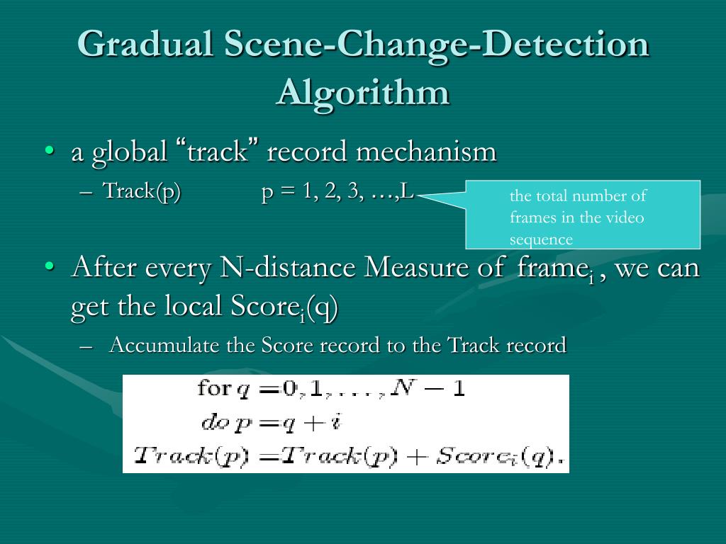 Gradual Scene-Change-Detection Algorithm • a global “track” record mechanism • Track(p) p = 1, 2, 3, …,L • After every N-distance Measure of framei , we can get the local Scorei(q) • Accumulate the Score record to the Track record • the total number of frames in the video sequence