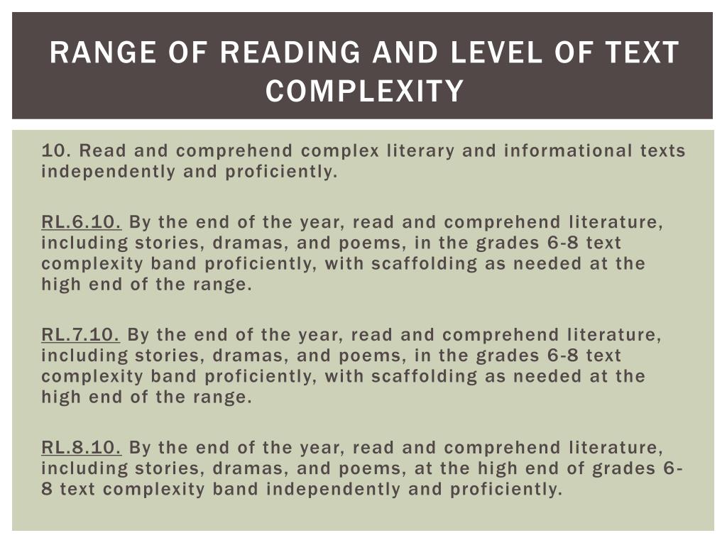 Range of Reading and Level of Text Complexity 10. Read and comprehend complex literary and informational texts independently and proficiently. RL.6.10. By the end of the year, read and comprehend literature, including stories, dramas, and poems, in the grades 6-8 text complexity band proficiently, with scaffolding as needed at the high end of the range. RL.7.10. By the end of the year, read and comprehend literature, including stories, dramas, and poems, in the grades 6-8 text complexity band proficiently, with scaffolding as needed at the high end of the range. RL.8.10. By the end of the year, read and comprehend literature, including stories, dramas, and poems, at the high end of grades 6-8 text complexity band independently and proficiently.