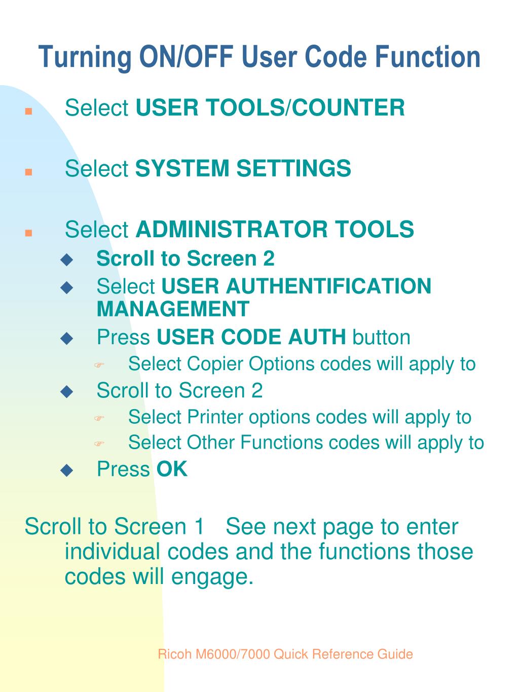 Turning ON/OFF User Code Function • Select USER TOOLS/COUNTER • Select SYSTEM SETTINGS • Select ADMINISTRATOR TOOLS • Scroll to Screen 2 • Select USER AUTHENTIFICATION MANAGEMENT • Press USER CODE AUTH button • Select Copier Options codes will apply to • Scroll to Screen 2 • Select Printer options codes will apply to • Select Other Functions codes will apply to • Press OK Scroll to Screen 1 See next page to enter individual codes and the functions those codes will engage. Ricoh M6000/7000 Quick Reference Guide