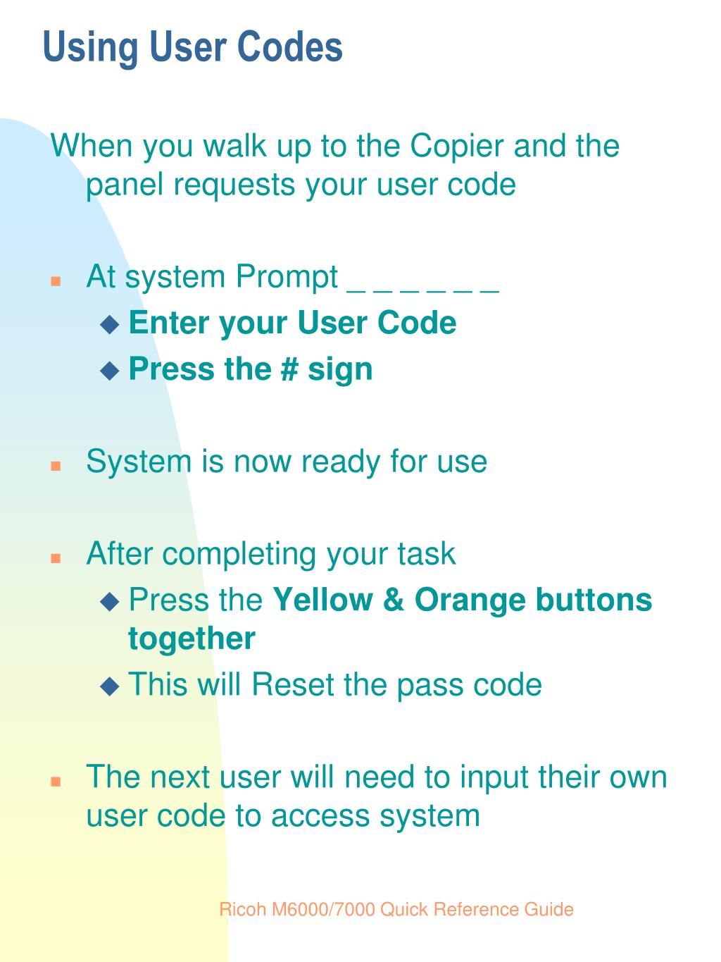 Using User Codes When you walk up to the Copier and the panel requests your user code • At system Prompt _ _ _ _ _ _ • Enter your User Code • Press the # sign • System is now ready for use • After completing your task • Press the Yellow & Orangebuttons together • This will Reset the pass code • The next user will need to input their own user code to access system Ricoh M6000/7000 Quick Reference Guide