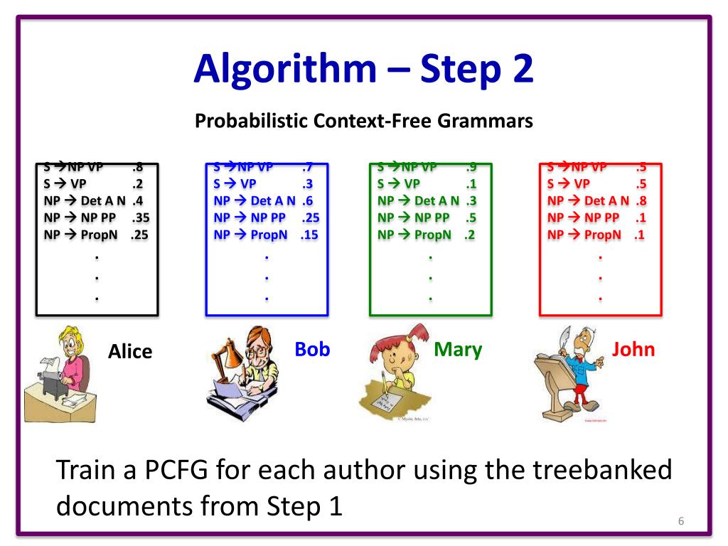Algorithm – Step 2 Probabilistic Context-Free Grammars S NP VP .8 S VP .2 NP Det A N .4 NP NP PP .35 NP PropN .25 . . . S NP VP .7 S VP .3 NP Det A N .6 NP NP PP .25 NP PropN .15 . . . S NP VP .9 S VP .1 NP Det A N .3 NP NP PP .5 NP PropN .2 . . . S NP VP .5 S VP .5 NP Det A N .8 NP NP PP .1 NP PropN .1 . . . Bob Mary John Alice Train a PCFG for each author using the treebanked documents from Step 1
