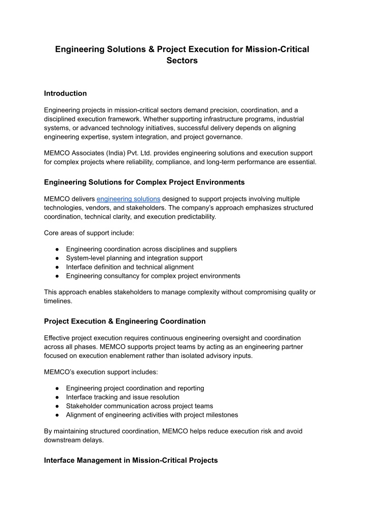 Insight into MEMCOu2019s execution-focused engineering solutions for complex and mission-critical projects. Highlights engineering coordination, interface management, project execution support, and structured delivery approaches for infrastructure and technology-driven programs.