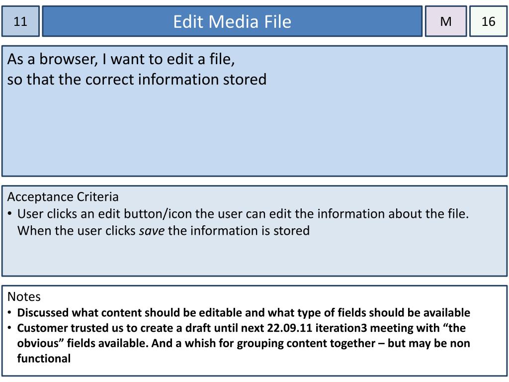11 Edit Media File M 16 As a browser, I want to edit a file, so that the correct information stored • Acceptance Criteria • User clicks an edit button/icon the user can edit the information about the file. When the user clicks save the information is stored • Notes • Discussed what content should be editable and what type of fields should be available • Customer trusted us to create a draft until next 22.09.11 iteration3 meeting with “the obvious” fields available. And a whish for grouping content together – but may be non functional