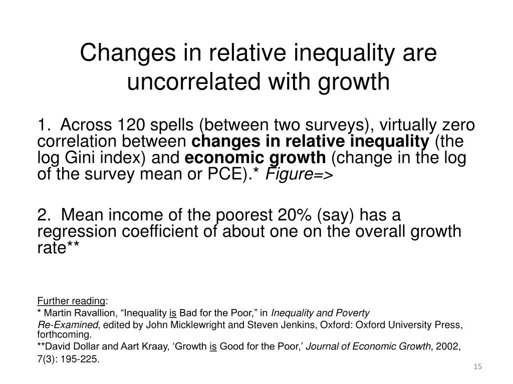 Changes in relative inequality are uncorrelated with growth 1. Across 120 spells (between two surveys), virtually zero correlation between changes in relative inequality (the log Gini index) and economic growth (change in the log of the survey mean or PCE).* Figure=> 2. Mean income of the poorest 20% (say) has a regression coefficient of about one on the overall growth rate** Further reading: * Martin Ravallion, “Inequality is Bad for the Poor,” in Inequality and Poverty Re-Examined, edited by John Micklewright and Steven Jenkins, Oxford: Oxford University Press, forthcoming. **David Dollar and Aart Kraay, ‘Growth is Good for the Poor,’ Journal of Economic Growth, 2002, 7(3): 195-225.