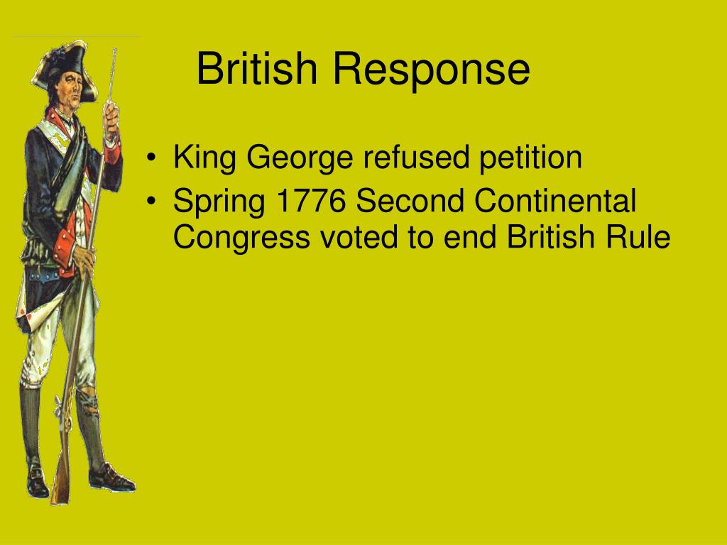 British Response • King George refused petition • Spring 1776 Second Continental Congress voted to end British Rule