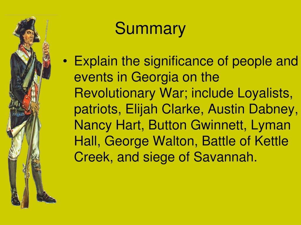 Summary • Explain the significance of people and events in Georgia on the Revolutionary War; include Loyalists, patriots, Elijah Clarke, Austin Dabney, Nancy Hart, Button Gwinnett, Lyman Hall, George Walton, Battle of Kettle Creek, and siege of Savannah.