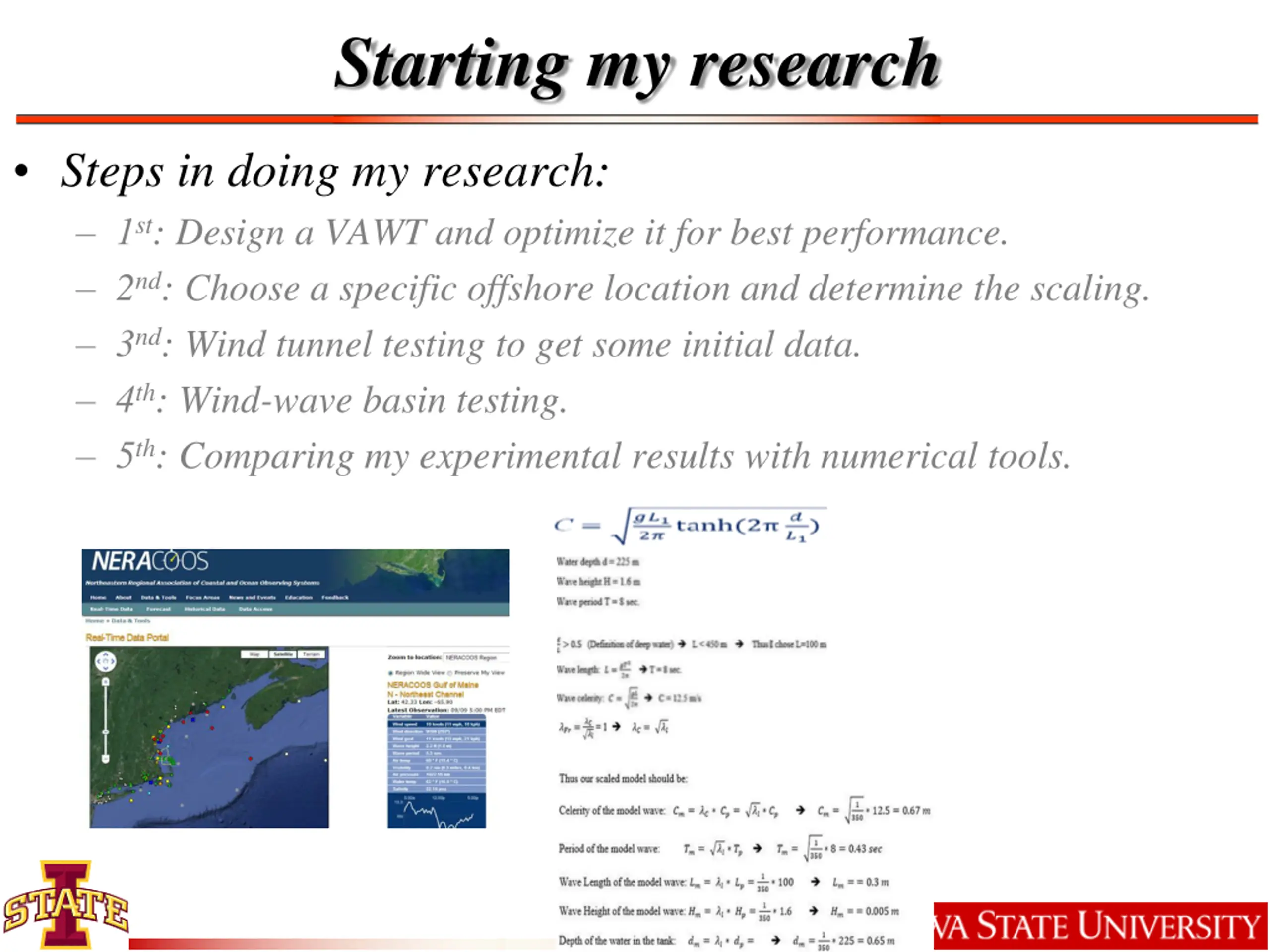 Starting my research • Steps in doing my research: – 1st: Design a VAWT and optimize it for best performance. – 2nd: Choose a specific offshore location and determine the scaling. – 3nd: Wind tunnel testing to get some initial data. – 4th: Wind-wave basin testing. – 5th: Comparing my experimental results with numerical tools.