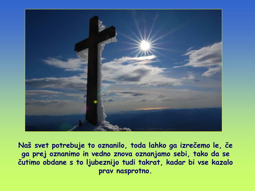 Naš svet potrebuje to oznanilo, toda lahko ga izrečemo le, če ga prej oznanimo in vedno znova oznanjamo sebi, tako da se čutimo obdane s to ljubeznijo tudi takrat, kadar bi vse kazalo prav nasprotno.