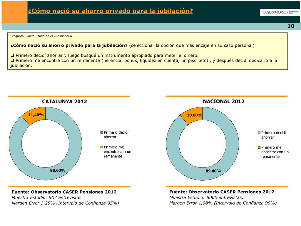 ¿Cómo nació su ahorro privado para la jubilación? Pregunta Exacta Usada en el Cuestionario ¿Cómo nació su ahorro privado para la jubilación? (seleccionar la opción que más encaje en su caso personal) • Primero decidí ahorrar y luego busqué un instrumento apropiado para meter el dinero. • Primero me encontré con un remanente (herencia, bonus, liquidez en cuenta, un piso…etc) , y después decidí dedicarlo a la jubilación. NACIONAL 2012 CATALUNYA 2012 Fuente: Observatorio CASER Pensiones 2012 Muestra Estudio: 8000 entrevistas. Margen Error 1,08% (Intervalo de Confianza 95%) Fuente: Observatorio CASER Pensiones 2012 Muestra Estudio: 907 entrevistas. Margen Error 3.25% (Intervalo de Confianza 95%)