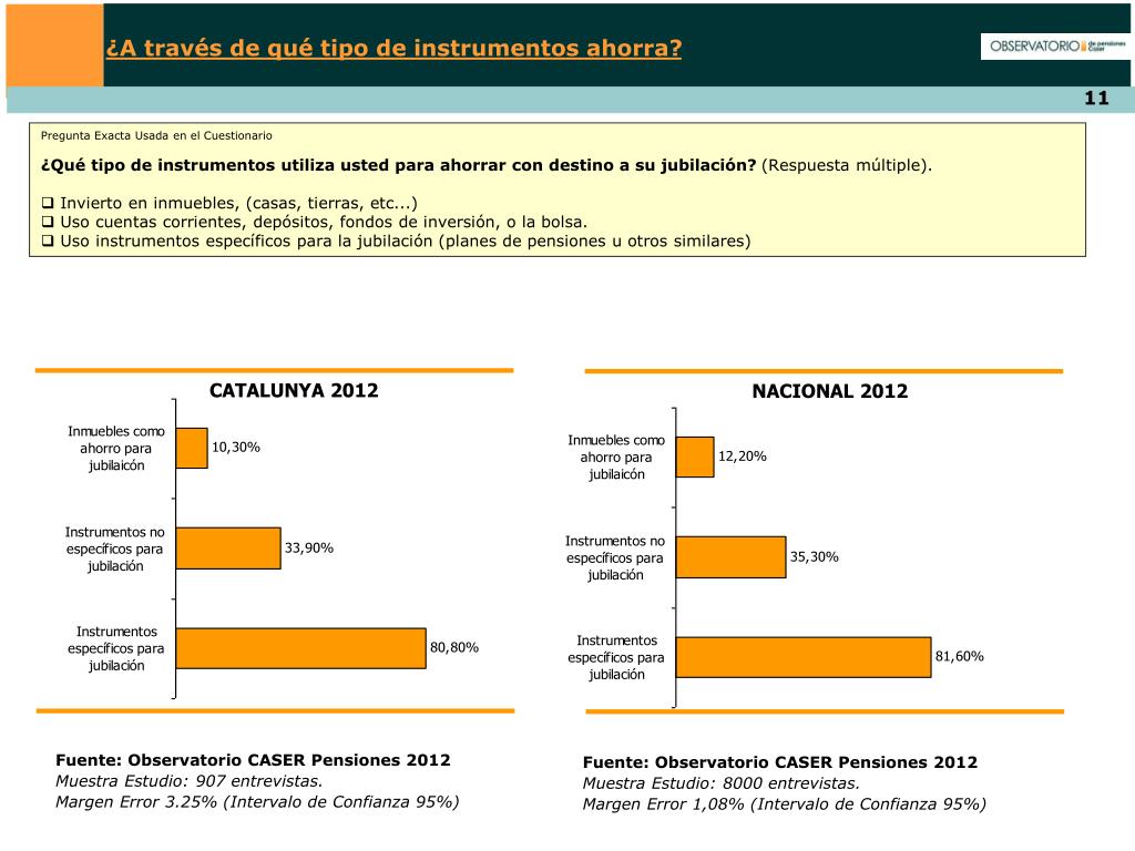¿A través de qué tipo de instrumentos ahorra? • Pregunta Exacta Usada en el Cuestionario • ¿Qué tipo de instrumentos utiliza usted para ahorrar con destino a su jubilación? (Respuesta múltiple). • Invierto en inmuebles, (casas, tierras, etc...) • Uso cuentas corrientes, depósitos, fondos de inversión, o la bolsa. • Uso instrumentos específicos para la jubilación (planes de pensiones u otros similares) CATALUNYA 2012 NACIONAL 2012 Fuente: Observatorio CASER Pensiones 2012 Muestra Estudio: 907 entrevistas. Margen Error 3.25% (Intervalo de Confianza 95%) Fuente: Observatorio CASER Pensiones 2012 Muestra Estudio: 8000 entrevistas. Margen Error 1,08% (Intervalo de Confianza 95%)