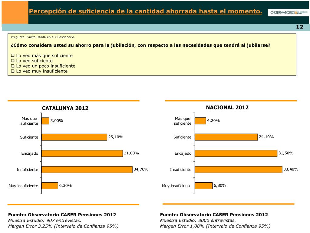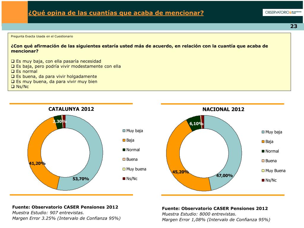¿Qué opina de las cuantías que acaba de mencionar? • Pregunta Exacta Usada en el Cuestionario • ¿Con qué afirmación de las siguientes estaría usted más de acuerdo, en relación con la cuantía que acaba de mencionar? • Es muy baja, con ella pasaría necesidad • Es baja, pero podría vivir modestamente con ella • Es normal • Es buena, da para vivir holgadamente • Es muy buena, da para vivir muy bien • Ns/Nc CATALUNYA 2012 NACIONAL 2012 Fuente: Observatorio CASER Pensiones 2012 Muestra Estudio: 907 entrevistas. Margen Error 3.25% (Intervalo de Confianza 95%) Fuente: Observatorio CASER Pensiones 2012 Muestra Estudio: 8000 entrevistas. Margen Error 1,08% (Intervalo de Confianza 95%)