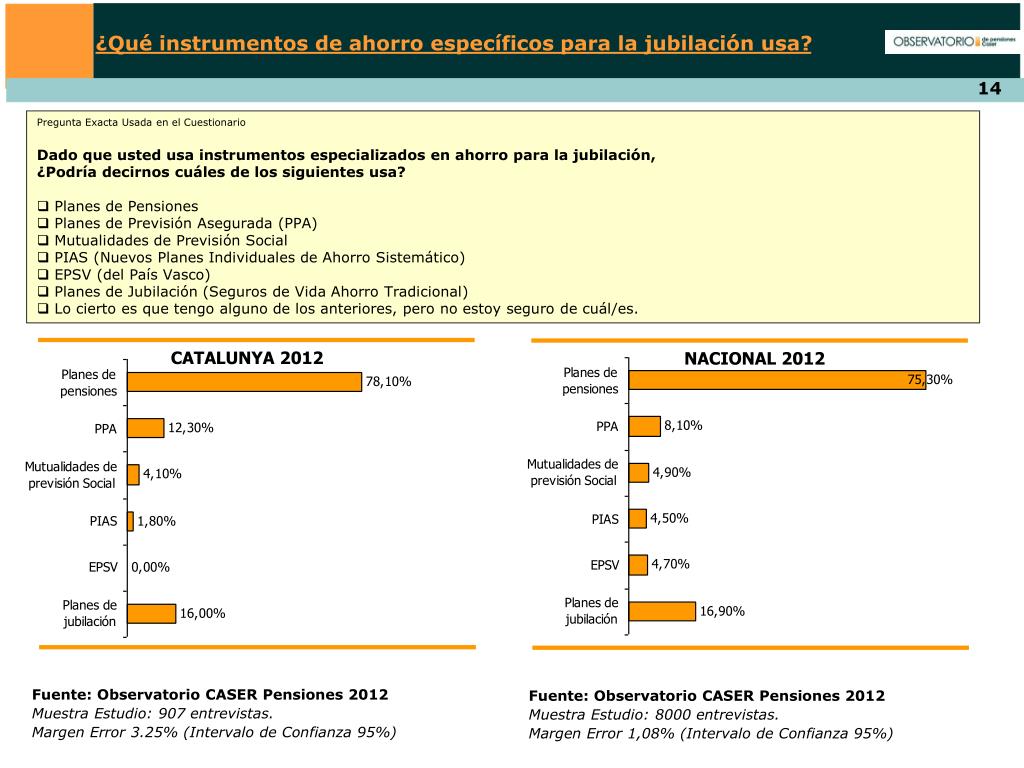¿Qué instrumentos de ahorro específicos para la jubilación usa? • Pregunta Exacta Usada en el Cuestionario • Dado que usted usa instrumentos especializados en ahorro para la jubilación, • ¿Podría decirnos cuáles de los siguientes usa? • Planes de Pensiones • Planes de Previsión Asegurada (PPA) • Mutualidades de Previsión Social • PIAS (Nuevos Planes Individuales de Ahorro Sistemático) • EPSV (del País Vasco) • Planes de Jubilación (Seguros de Vida Ahorro Tradicional) • Lo cierto es que tengo alguno de los anteriores, pero no estoy seguro de cuál/es. CATALUNYA 2012 NACIONAL 2012 Fuente: Observatorio CASER Pensiones 2012 Muestra Estudio: 907 entrevistas. Margen Error 3.25% (Intervalo de Confianza 95%) Fuente: Observatorio CASER Pensiones 2012 Muestra Estudio: 8000 entrevistas. Margen Error 1,08% (Intervalo de Confianza 95%)