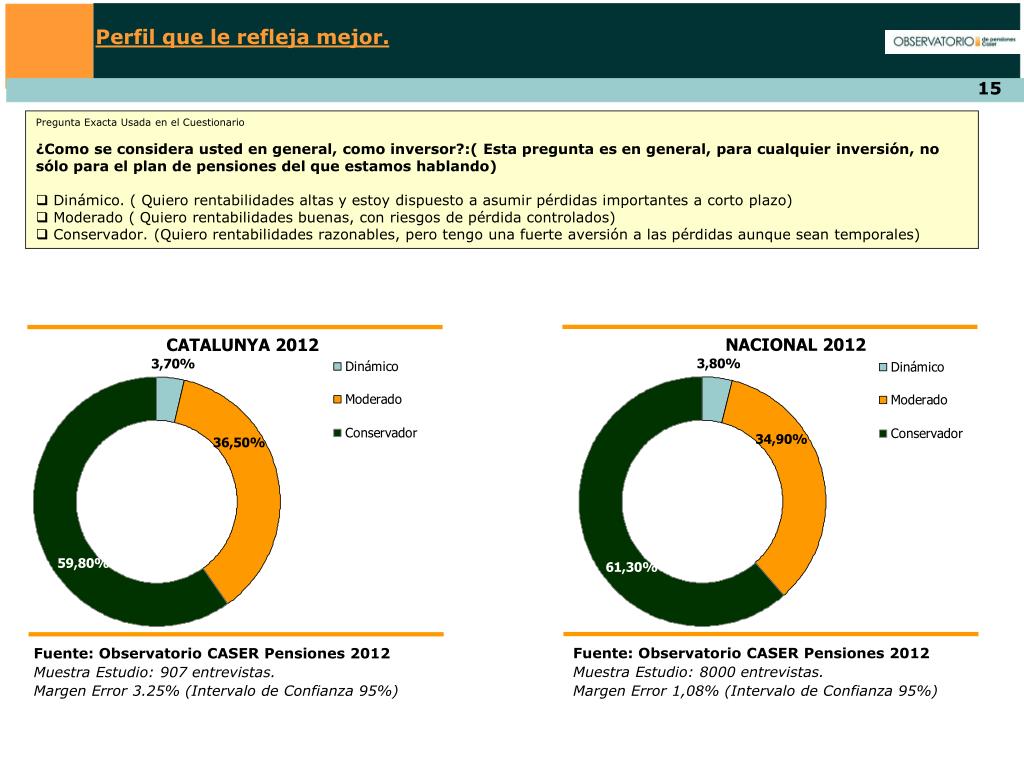 Perfil que le refleja mejor. Pregunta Exacta Usada en el Cuestionario • ¿Como se considera usted en general, como inversor?:( Esta pregunta es en general, para cualquier inversión, no sólo para el plan de pensiones del que estamos hablando) • Dinámico. ( Quiero rentabilidades altas y estoy dispuesto a asumir pérdidas importantes a corto plazo) • Moderado ( Quiero rentabilidades buenas, con riesgos de pérdida controlados) • Conservador. (Quiero rentabilidades razonables, pero tengo una fuerte aversión a las pérdidas aunque sean temporales) NACIONAL 2012 CATALUNYA 2012 Fuente: Observatorio CASER Pensiones 2012 Muestra Estudio: 8000 entrevistas. Margen Error 1,08% (Intervalo de Confianza 95%) Fuente: Observatorio CASER Pensiones 2012 Muestra Estudio: 907 entrevistas. Margen Error 3.25% (Intervalo de Confianza 95%)