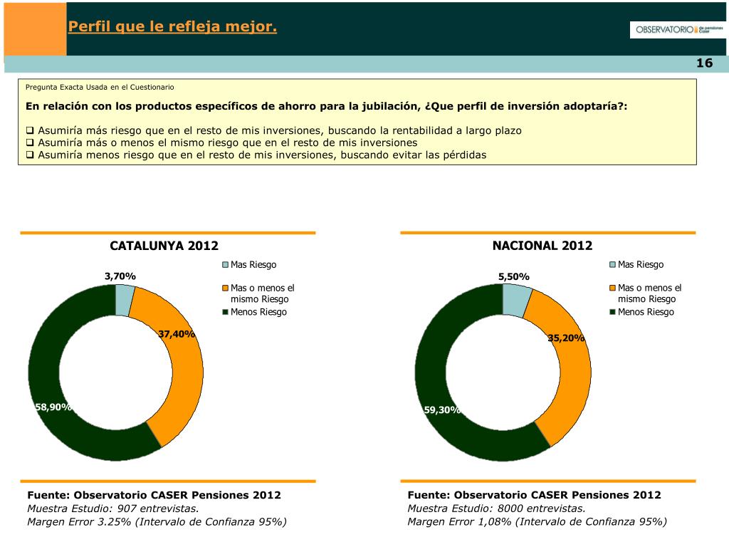 Perfil que le refleja mejor. Pregunta Exacta Usada en el Cuestionario • En relación con los productos específicos de ahorro para la jubilación, ¿Que perfil de inversión adoptaría?: • Asumiría más riesgo que en el resto de mis inversiones, buscando la rentabilidad a largo plazo • Asumiría más o menos el mismo riesgo que en el resto de mis inversiones • Asumiría menos riesgo que en el resto de mis inversiones, buscando evitar las pérdidas NACIONAL 2012 CATALUNYA 2012 Fuente: Observatorio CASER Pensiones 2012 Muestra Estudio: 8000 entrevistas. Margen Error 1,08% (Intervalo de Confianza 95%) Fuente: Observatorio CASER Pensiones 2012 Muestra Estudio: 907 entrevistas. Margen Error 3.25% (Intervalo de Confianza 95%)