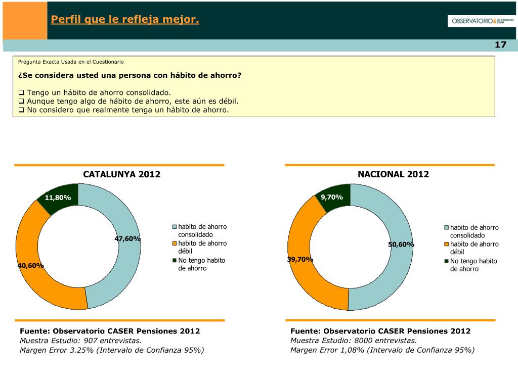 Perfil que le refleja mejor. Pregunta Exacta Usada en el Cuestionario • ¿Se considera usted una persona con hábito de ahorro? • Tengo un hábito de ahorro consolidado. • Aunque tengo algo de hábito de ahorro, este aún es débil. • No considero que realmente tenga un hábito de ahorro. NACIONAL 2012 CATALUNYA 2012 Fuente: Observatorio CASER Pensiones 2012 Muestra Estudio: 8000 entrevistas. Margen Error 1,08% (Intervalo de Confianza 95%) Fuente: Observatorio CASER Pensiones 2012 Muestra Estudio: 907 entrevistas. Margen Error 3.25% (Intervalo de Confianza 95%)