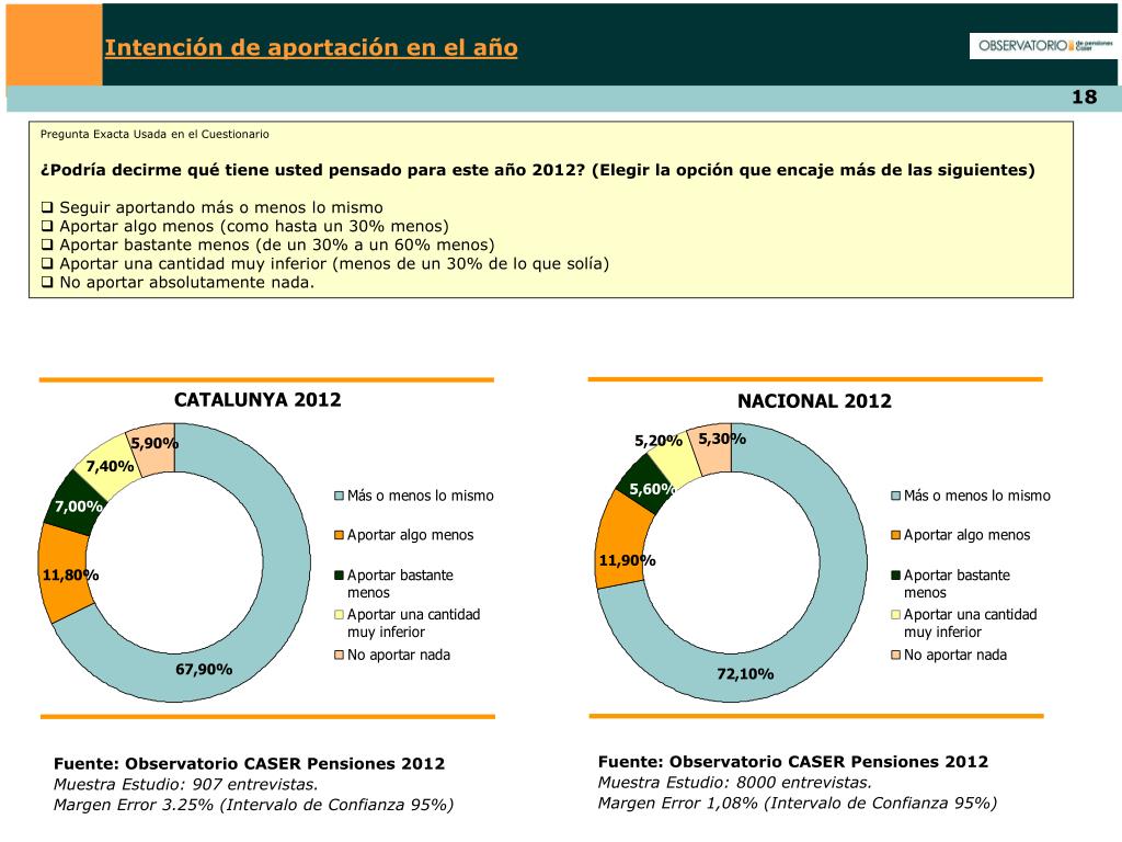 Intención de aportación en el año • Pregunta Exacta Usada en el Cuestionario • ¿Podría decirme qué tiene usted pensado para este año 2012? (Elegir la opción que encaje más de las siguientes) • Seguir aportando más o menos lo mismo • Aportar algo menos (como hasta un 30% menos) • Aportar bastante menos (de un 30% a un 60% menos) • Aportar una cantidad muy inferior (menos de un 30% de lo que solía) • No aportar absolutamente nada. CATALUNYA 2012 NACIONAL 2012 Fuente: Observatorio CASER Pensiones 2012 Muestra Estudio: 8000 entrevistas. Margen Error 1,08% (Intervalo de Confianza 95%) Fuente: Observatorio CASER Pensiones 2012 Muestra Estudio: 907 entrevistas. Margen Error 3.25% (Intervalo de Confianza 95%)