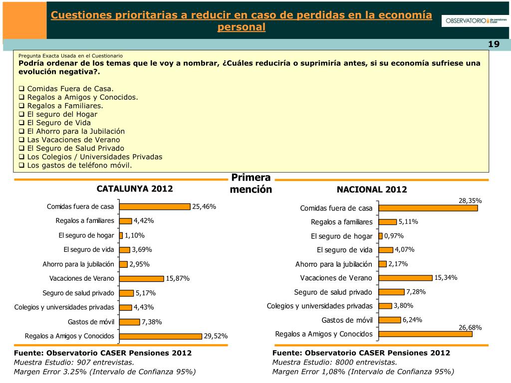 Cuestiones prioritarias a reducir en caso de perdidas en la economía personal • Pregunta Exacta Usada en el Cuestionario • Podría ordenar de los temas que le voy a nombrar, ¿Cuáles reduciría o suprimiría antes, si su economía sufriese una evolución negativa?. • Comidas Fuera de Casa. • Regalos a Amigos y Conocidos. • Regalos a Familiares. • El seguro del Hogar • El Seguro de Vida • El Ahorro para la Jubilación • Las Vacaciones de Verano • El Seguro de Salud Privado • Los Colegios / Universidades Privadas • Los gastos de teléfono móvil. Primera mención CATALUNYA 2012 NACIONAL 2012 Fuente: Observatorio CASER Pensiones 2012 Muestra Estudio: 8000 entrevistas. Margen Error 1,08% (Intervalo de Confianza 95%) Fuente: Observatorio CASER Pensiones 2012 Muestra Estudio: 907 entrevistas. Margen Error 3.25% (Intervalo de Confianza 95%)