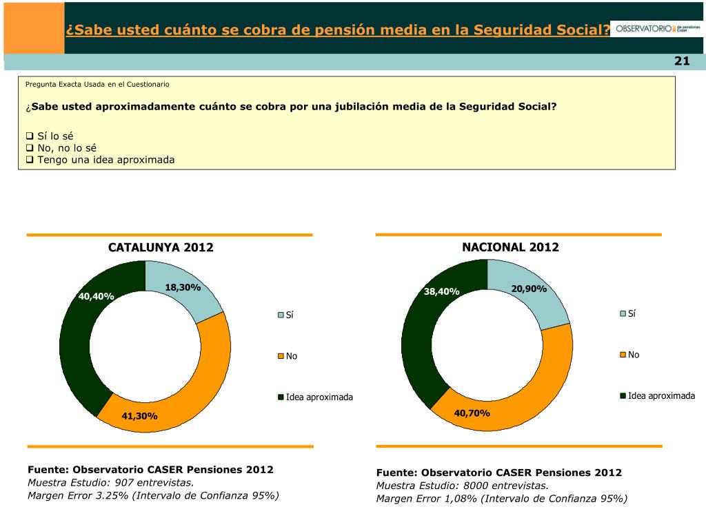 ¿Sabe usted cuánto se cobra de pensión media en la Seguridad Social? • Pregunta Exacta Usada en el Cuestionario • ¿Sabe usted aproximadamente cuánto se cobra por una jubilación media de la Seguridad Social? • Sí lo sé • No, no lo sé • Tengo una idea aproximada NACIONAL 2012 CATALUNYA 2012 Fuente: Observatorio CASER Pensiones 2012 Muestra Estudio: 907 entrevistas. Margen Error 3.25% (Intervalo de Confianza 95%) Fuente: Observatorio CASER Pensiones 2012 Muestra Estudio: 8000 entrevistas. Margen Error 1,08% (Intervalo de Confianza 95%)