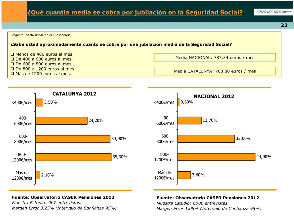 ¿Qué cuantía media se cobra por jubilación en la Seguridad Social? • Pregunta Exacta Usada en el Cuestionario • ¿Sabe usted aproximadamente cuánto se cobra por una jubilación media de la Seguridad Social? • Menos de 400 euros al mes. • De 400 a 600 euros al mes. • De 600 a 800 euros al mes. • De 800 a 1200 euros al mes • Más de 1200 euros al mes. Media NACIONAL: 787.54 euros / mes Media CATALUNYA: 788.80 euros / mes CATALUNYA 2012 NACIONAL 2012 Fuente: Observatorio CASER Pensiones 2012 Muestra Estudio: 907 entrevistas. Margen Error 3.25% (Intervalo de Confianza 95%) Fuente: Observatorio CASER Pensiones 2012 Muestra Estudio: 8000 entrevistas. Margen Error 1,08% (Intervalo de Confianza 95%)