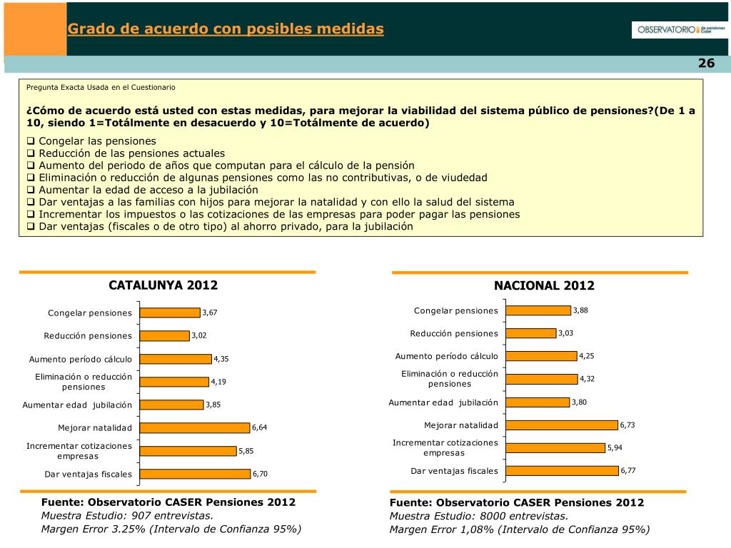 Grado de acuerdo con posibles medidas Pregunta Exacta Usada en el Cuestionario ¿Qué grado de confianza tiene usted en que resuelva con éxito, junto con el gobierno, el problema de las pensiones? (De 1 a 10, siendo 1= Muy baja y 10= Muy alta) NACIONAL 2012 CATALUNYA 2012 Fuente: Observatorio CASER Pensiones 2012 Muestra Estudio: 8000 entrevistas. Margen Error 1,08% (Intervalo de Confianza 95%) Fuente: Observatorio CASER Pensiones 2012 Muestra Estudio: 907 entrevistas. Margen Error 3.25% (Intervalo de Confianza 95%)
