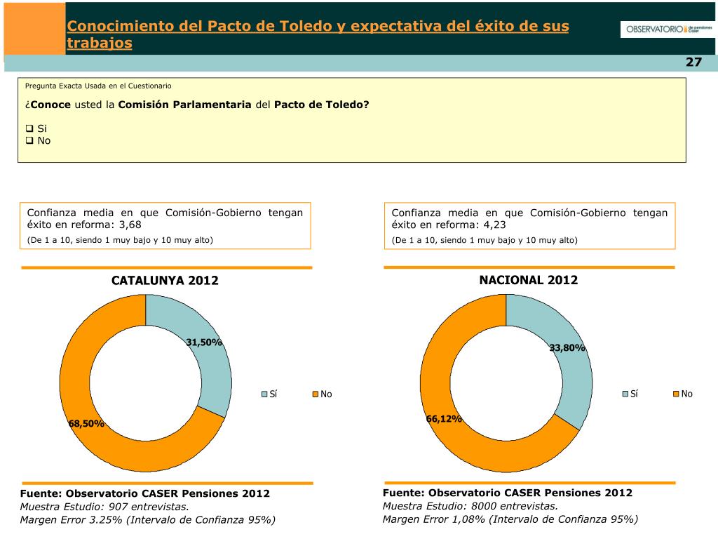 Conocimiento del Pacto de Toledo y expectativa del éxito de sus trabajos Pregunta Exacta Usada en el Cuestionario ¿Conoce usted la ComisiónParlamentaria del PactodeToledo? • Si • No Confianza media en que Comisión-Gobierno tengan éxito en reforma: 3,68 (De 1 a 10, siendo 1 muy bajo y 10 muy alto) Confianza media en que Comisión-Gobierno tengan éxito en reforma: 4,23 (De 1 a 10, siendo 1 muy bajo y 10 muy alto) NACIONAL 2012 CATALUNYA 2012 Fuente: Observatorio CASER Pensiones 2012 Muestra Estudio: 8000 entrevistas. Margen Error 1,08% (Intervalo de Confianza 95%) Fuente: Observatorio CASER Pensiones 2012 Muestra Estudio: 907 entrevistas. Margen Error 3.25% (Intervalo de Confianza 95%)