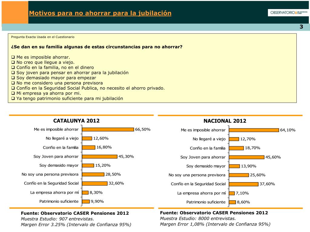 Motivos para no ahorrar para la jubilación • Pregunta Exacta Usada en el Cuestionario • ¿Se dan en su familia algunas de estas circunstancias para no ahorrar? • Me es imposible ahorrar. • No creo que llegue a viejo. • Confío en la familia, no en el dinero • Soy joven para pensar en ahorrar para la jubilación • Soy demasiado mayor para empezar • No me considero una persona previsora • Confío en la Seguridad Social Publica, no necesito el ahorro privado. • Mi empresa ya ahorra por mi. • Ya tengo patrimonio suficiente para mi jubilación CATALUNYA 2012 NACIONAL 2012 Fuente: Observatorio CASER Pensiones 2012 Muestra Estudio: 8000 entrevistas. Margen Error 1,08% (Intervalo de Confianza 95%) Fuente: Observatorio CASER Pensiones 2012 Muestra Estudio: 907 entrevistas. Margen Error 3.25% (Intervalo de Confianza 95%)