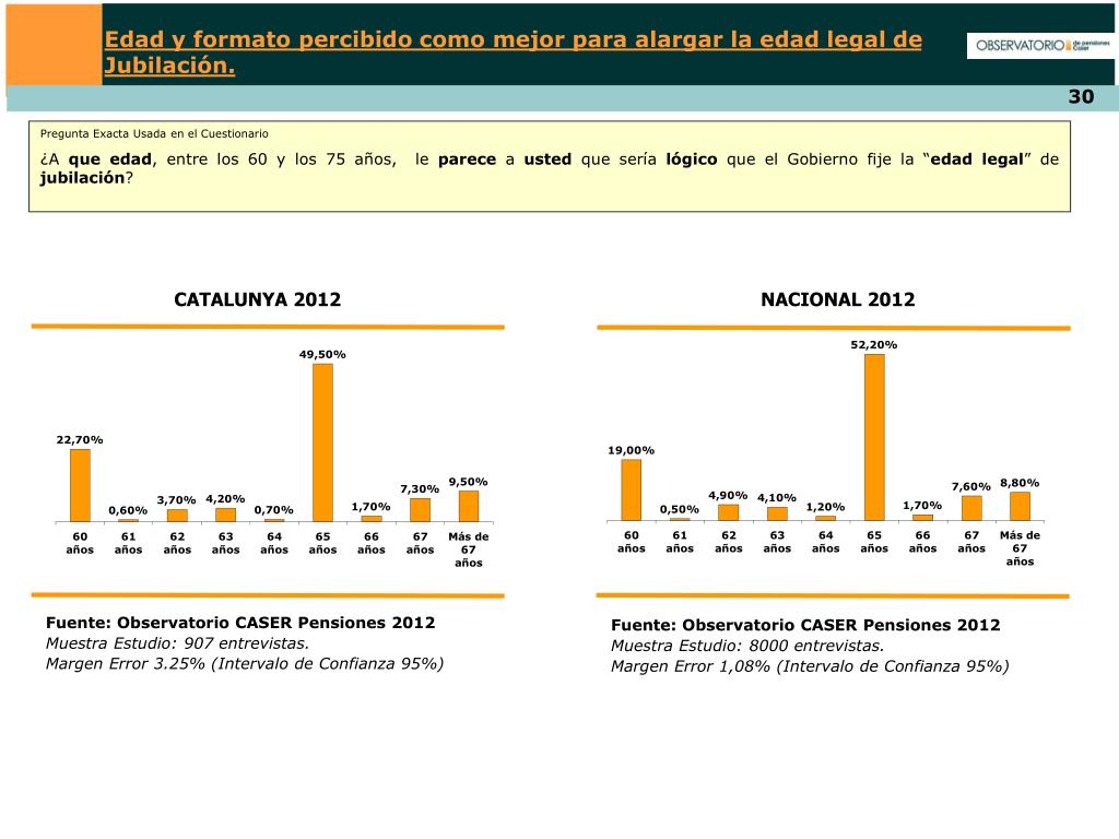 Edad y formato percibido como mejor para alargar la edad legal de Jubilación. Pregunta Exacta Usada en el Cuestionario ¿A queedad, entre los 60 y los 75 años, le parece a usted que sería lógico que el Gobierno fije la “edadlegal” de jubilación? CATALUNYA 2012 NACIONAL 2012 Fuente: Observatorio CASER Pensiones 2012 Muestra Estudio: 907 entrevistas. Margen Error 3.25% (Intervalo de Confianza 95%) Fuente: Observatorio CASER Pensiones 2012 Muestra Estudio: 8000 entrevistas. Margen Error 1,08% (Intervalo de Confianza 95%)