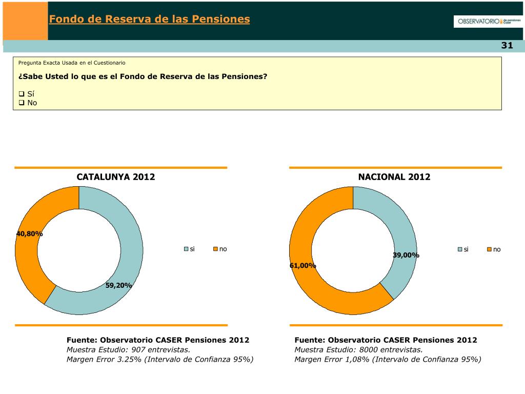 Fondo de Reserva de las Pensiones Pregunta Exacta Usada en el Cuestionario • ¿Sabe Usted lo que es el Fondo de Reserva de las Pensiones? • Sí • No CATALUNYA 2012 NACIONAL 2012 Fuente: Observatorio CASER Pensiones 2012 Muestra Estudio: 907 entrevistas. Margen Error 3.25% (Intervalo de Confianza 95%) Fuente: Observatorio CASER Pensiones 2012 Muestra Estudio: 8000 entrevistas. Margen Error 1,08% (Intervalo de Confianza 95%)