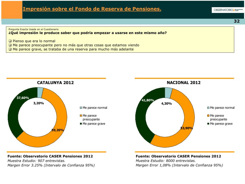 Impresión sobre el Fondo de Reserva de Pensiones. Pregunta Exacta Usada en el Cuestionario ¿Qué impresión le produce saber que podría empezar a usarse en este mismo año? • Pienso que era lo normal • Me parece preocupante pero no más que otras cosas que estamos viendo • Me parece grave, se trataba de una reserva para mucho más adelante NACIONAL 2012 CATALUNYA 2012 Fuente: Observatorio CASER Pensiones 2012 Muestra Estudio: 8000 entrevistas. Margen Error 1,08% (Intervalo de Confianza 95%) Fuente: Observatorio CASER Pensiones 2012 Muestra Estudio: 907 entrevistas. Margen Error 3.25% (Intervalo de Confianza 95%)