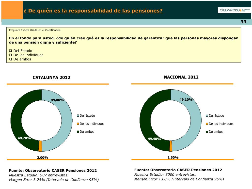 ¿ De quién es la responsabilidad de las pensiones? • Pregunta Exacta Usada en el Cuestionario • En el fondo para usted, ¿de quién cree qué es la responsabilidad de garantizar que las personas mayores dispongan de una pensión digna y suficiente? • Del Estado • De los individuos • De ambos NACIONAL 2012 CATALUNYA 2012 Fuente: Observatorio CASER Pensiones 2012 Muestra Estudio: 8000 entrevistas. Margen Error 1,08% (Intervalo de Confianza 95%) Fuente: Observatorio CASER Pensiones 2012 Muestra Estudio: 907 entrevistas. Margen Error 3.25% (Intervalo de Confianza 95%)